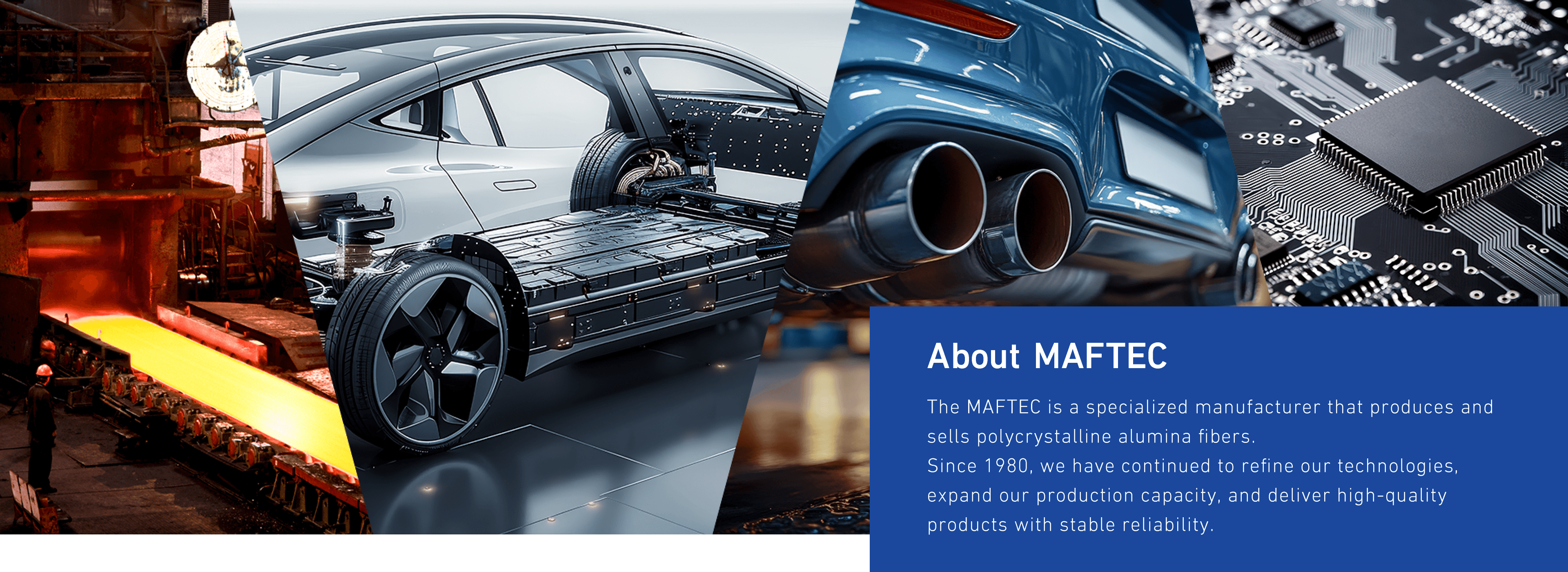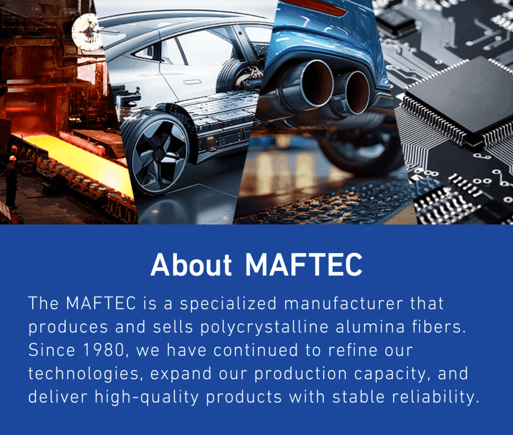 Established in March 2022 through the succession of Mitsubishi Chemical’s alumina fiber business, the MAFTEC is a specialized manufacturer that produces and sells the Polycrystalline Alumina Fiber MAFTEC™. Since we began developing our products in 1980, we have continuously refined our technologies, and today we deliver high-quality, high-performance products to customers around the world through a robust supply framework. We strive to meet the increasingly diverse needs of the market and to create new products that further enhance customer satisfaction and contribute to society.